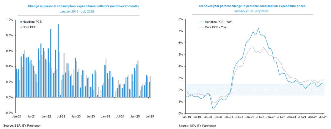🎈 Inflation heats up. The personal consumption expenditures (PCE) price index in July was up 2.6% from a year ago. The core PCE price index — the Federal Reserve’s preferred measure of inflation — was up 2.8% during the month. While it’s above the Fed’s 2% target, it remains near its lowest level since March 2021.