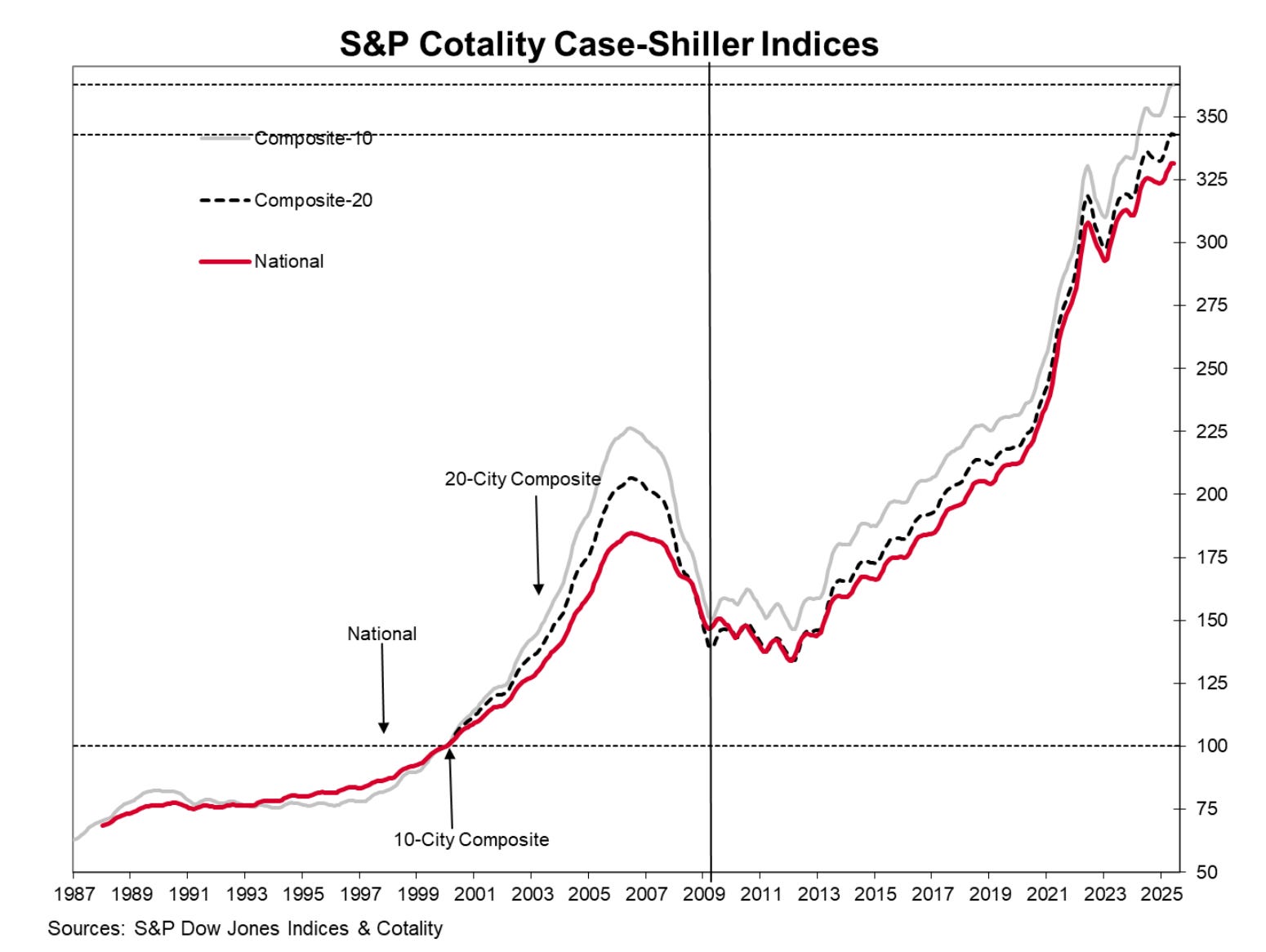 🏠 Home prices cool. According to the S&P CoreLogic Case-Shiller index, home prices were up 1.9% year-over-year in June but declined 0.3% month-over-month. From S&P Dow Jones Indices’ Nicholas Godec: “For the first time in years, home prices are failing to keep pace with broader inflation. From June 2024 to June 2025, the Consumer Price Index climbed 2.7%, substantially outpacing the 1.9% gain in national home prices. This reversal is historically significant: During the pandemic surge, home values were climbing at double-digit annual rates that far exceeded inflation, building substantial real wealth for homeowners. Now, American housing wealth has actually declined in inflation-adjusted terms over the past year—a notable erosion that reflects the market's new equilibrium.”