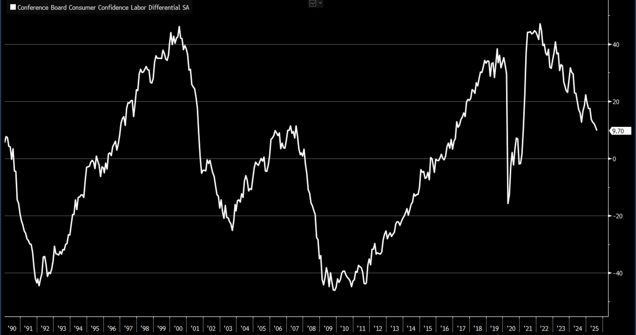Many economists monitor the spread between these two percentages (a.k.a., the labor market differential), and it has been reflecting a cooling labor market.