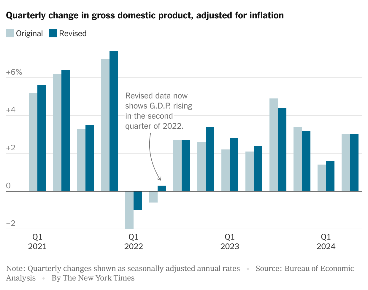 Fast forward to present day — more than two years later. On Thursday, the BEA released an update on U.S. GDP. Among other things, it provided revisions to older measurement periods. And as the New York Times’ Ben Casselman observed, the Q2 2022 GDP growth estimate flipped to positive from negative.