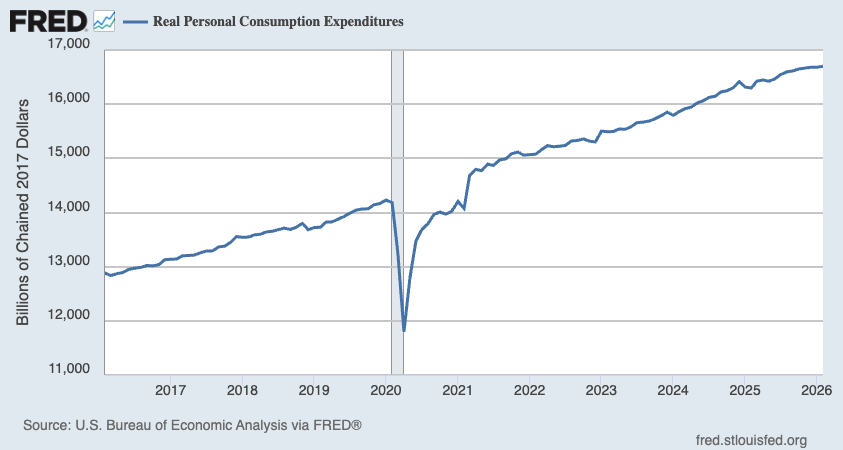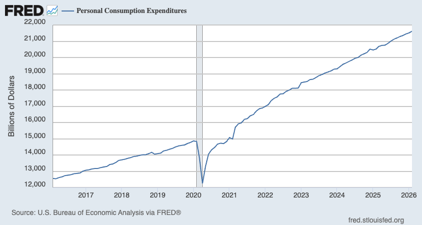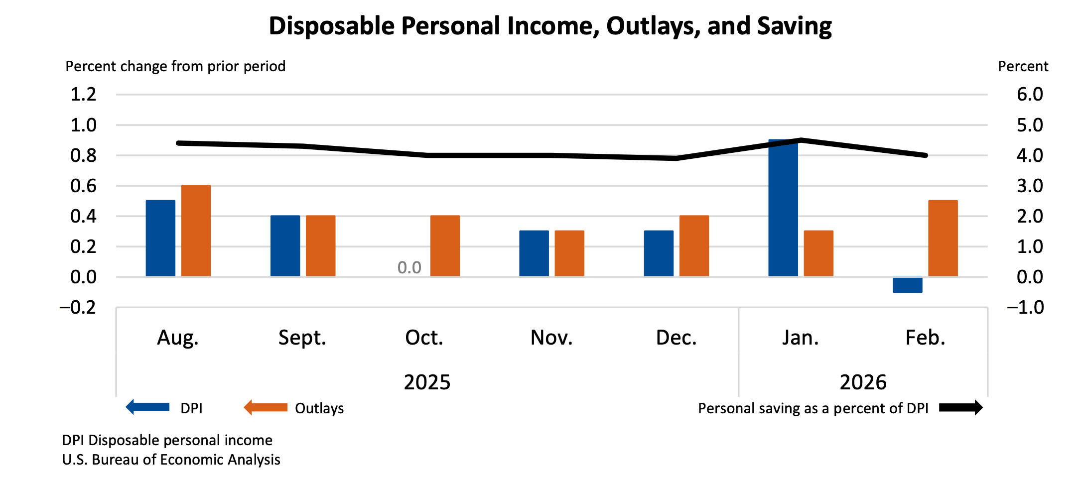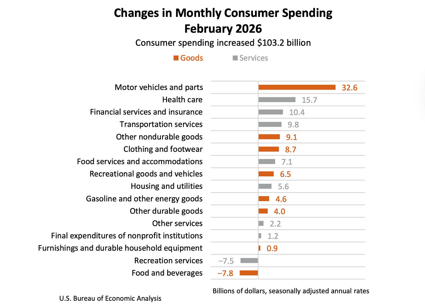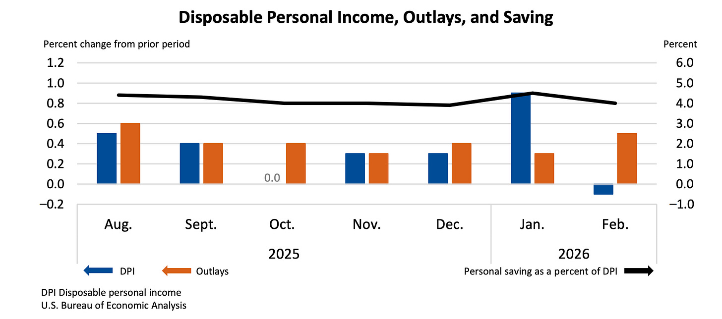 🤑 Consumers were spending, even as incomes fell. According to BEA data, personal consumption expenditures increased 0.5% month-over-month in February to an annual rate of $21.65 trillion, an all-time high.