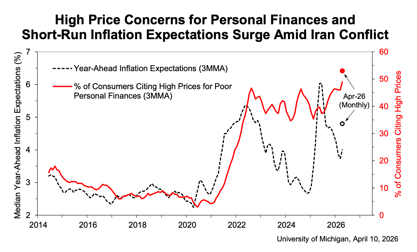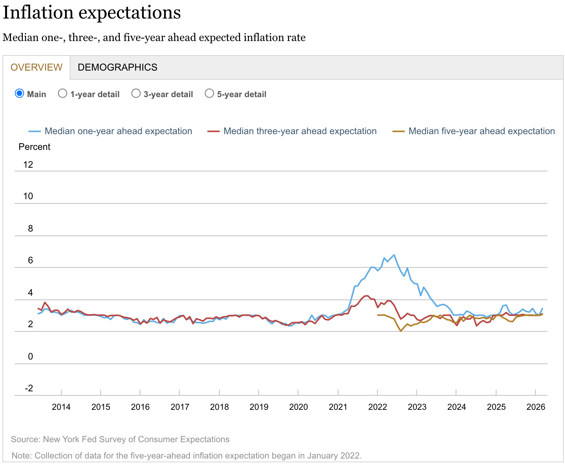 🎈 Inflation expectations worsen as gas prices surge. From the New York Fed’s March Survey of Consumer Expectations: “Gas price growth expectations surged to the highest level since March 2022. … Median inflation expectations increased by 0.4 percentage point to 3.4% at the one-year-ahead horizon, increased by 0.1 percentage point to 3.1% at the three-year-ahead horizon, and were unchanged at 3.0% at the five-year-ahead horizon in March.”