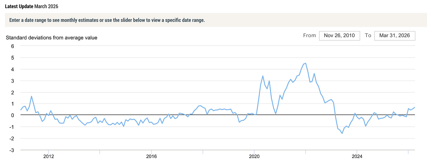 ⛓️ Supply chain pressures are building. The New York Fed’s Global Supply Chain Pressure Index — a composite of various supply chain indicators — ticked higher in March. While it’s way down from its December 2021 supply chain crisis high, it has returned to its highest level since January 2023.