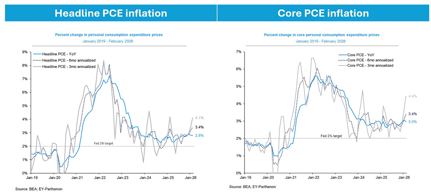 On a month-over-month basis, the core PCE price index was up 0.37%. If you annualize the rolling three-month and six-month figures — a reflection of the near-term trend in prices — the core PCE price index was up 4.4% and 3.4%, respectively.