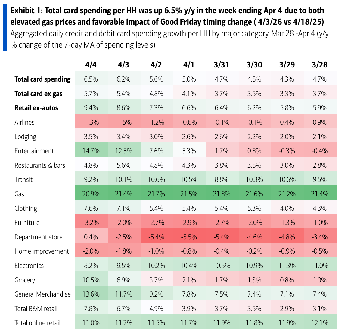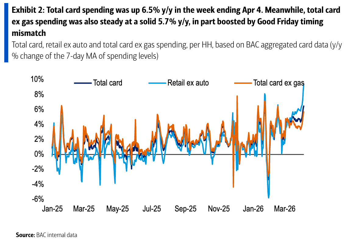 💳 Card spending data is holding up. From BofA: “Total card spending per HH was up 6.5% y/y in the week ending Apr 4, according to BAC aggregated credit & debit card data. Total card ex gas spending remained steady at a solid 5.7% y/y with a rise in entertainment, grocery & GM since last week. Also, y/y spending is being boosted by Good Friday timing mismatch (4/3/26 vs 4/18/25).“