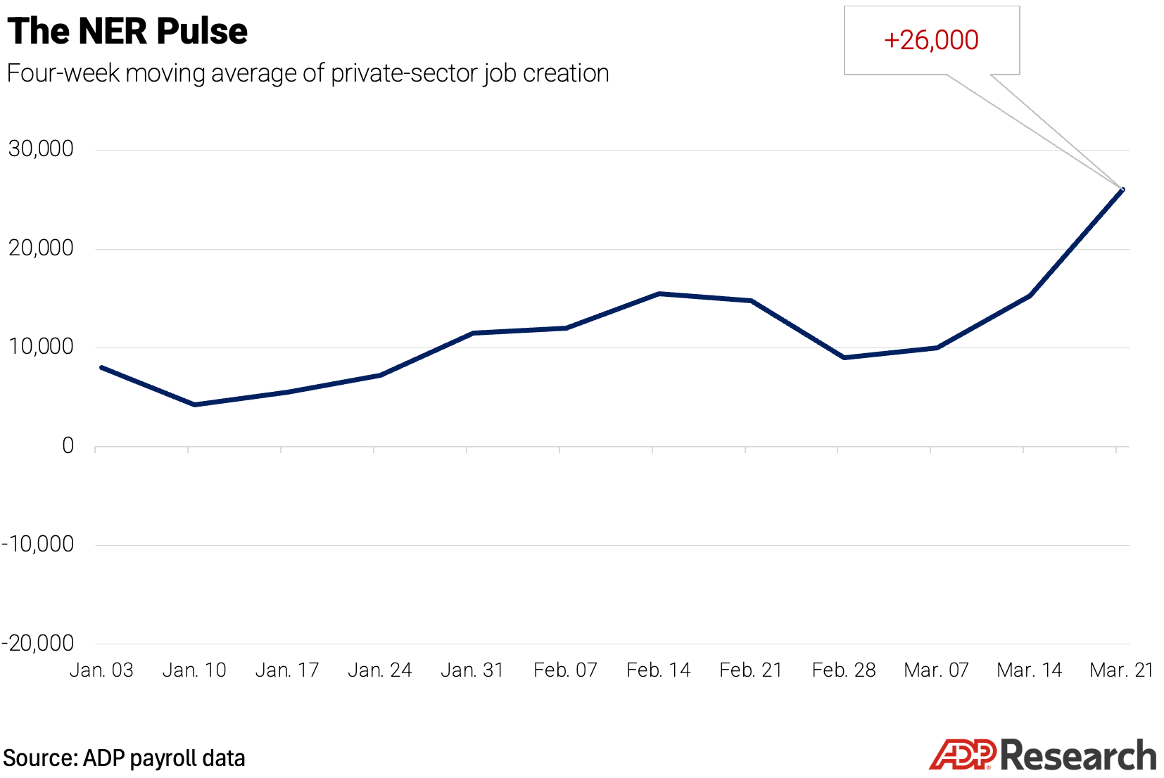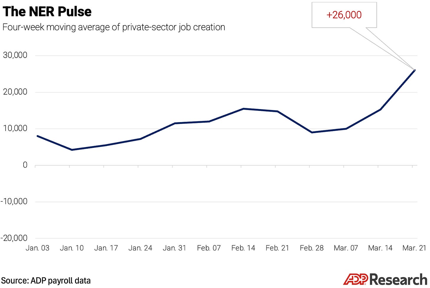 🤔 Recent private job growth has picked up, but remains lackluster. According to payroll processor ADP, private U.S. employers added 26,000 jobs in the four weeks ending March 21.