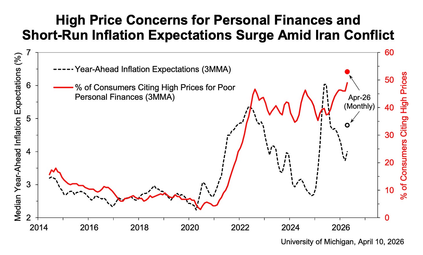 More from the survey: “Assessments of personal finances declined about 11%, with consumers expressing a substantial increase in concerns over high prices and weaker asset values. Buying conditions for durables and vehicles worsened, again on the basis of high prices.“