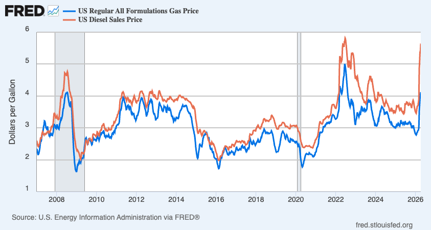 Here’s a look at the trajectory of gas and diesel prices, as tracked by the EIA.