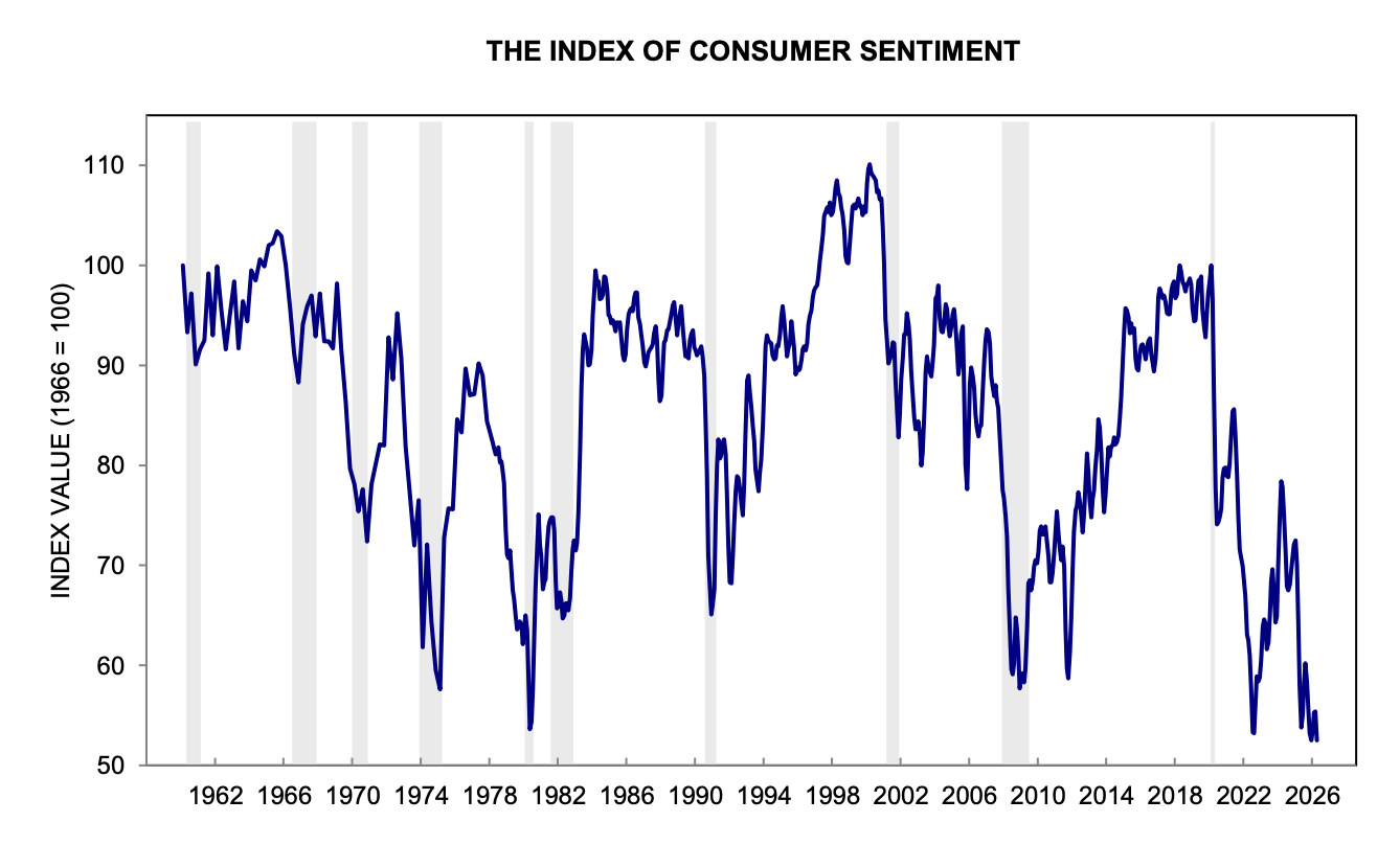 👎 Consumer vibes are in the dumps. From the University of Michigan’s March Surveys of Consumers: “Consumer sentiment sank about 11% this month, extending a decline that began with the start of the Iran conflict, and is currently about 9% below a year ago. Demographic groups across age, income, and political party all posted setbacks in sentiment, as did every component of the index, reflecting the widespread nature of this month’s fall. One-year expected business conditions plunged about 20% and is now 6% below last April.”
