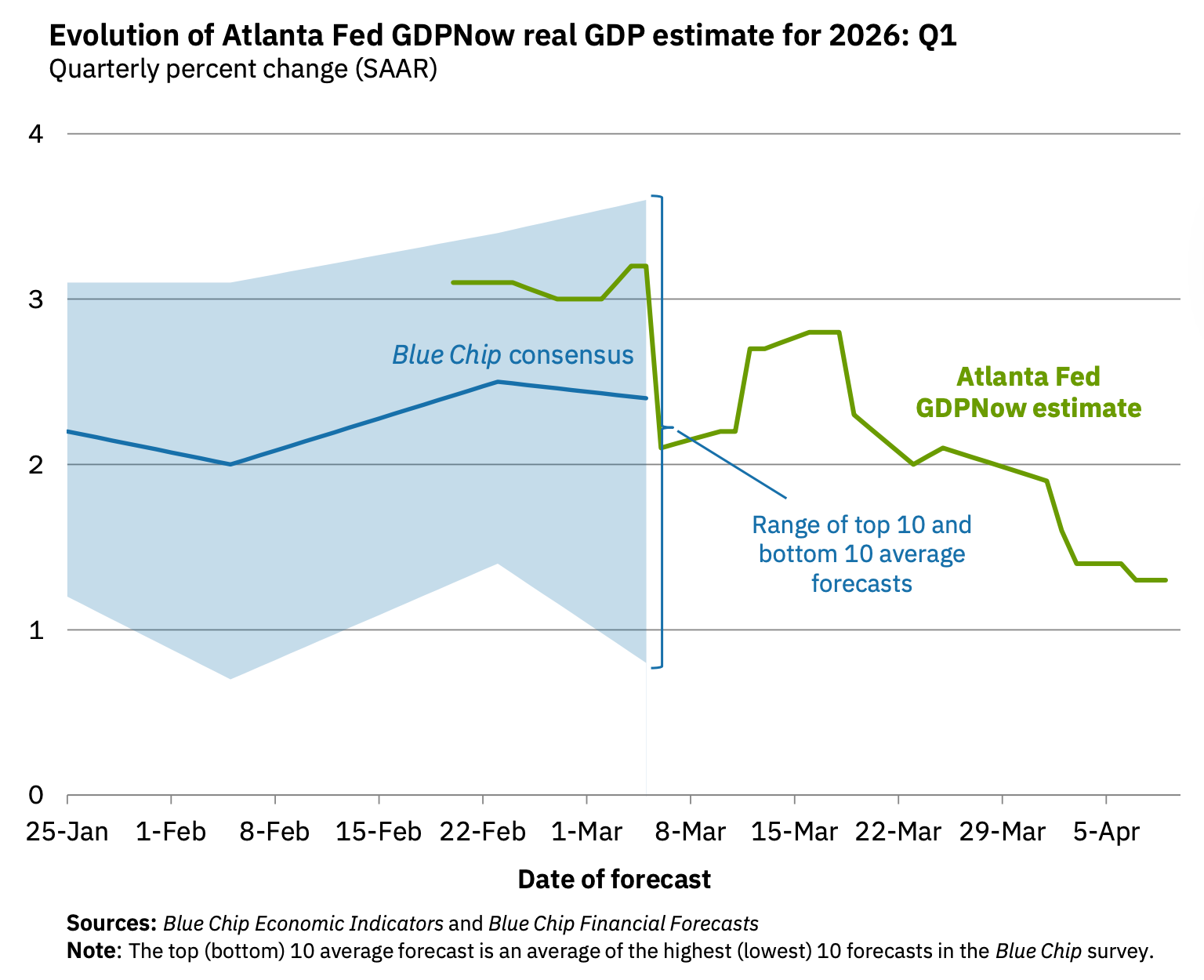 📈 Near-term GDP growth estimates are tracking positively. The Atlanta Fed’s GDPNow model sees real GDP growth rising at a 1.3% rate in Q1.