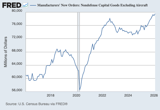🏭 Business investment activity rose to new record. Orders for nondefense capital goods excluding aircraft — a.k.a. core capex or business investment — climbed 0.7% to a record $79.53 billion in February.
