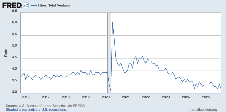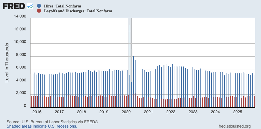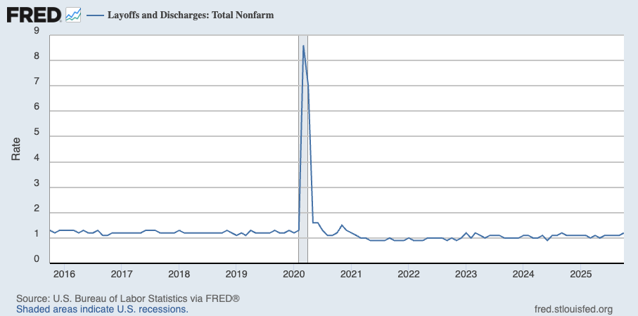 👎 Layoff activity picked up, hiring slows. Employers laid off 1.85 million people in October, the highest level since January 2023. While challenging for the people affected, this figure still represents just 1.2% of total employment. This metric is consistent with a growing economy. But it’s also at the highest rate since September 2024.