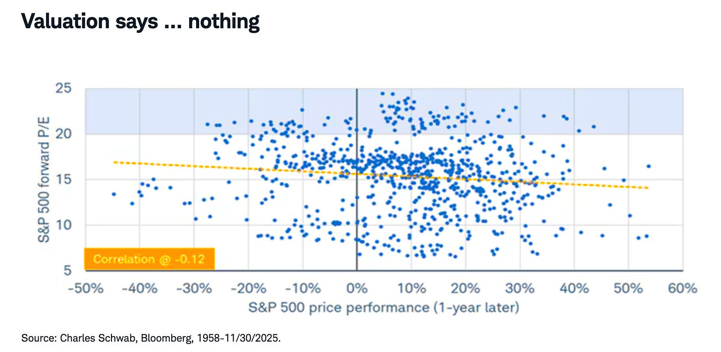 In their 2025 outlook report, Schwab’s Liz Ann Sonders and Kevin Gordon shared this fantastic illustration (which TKer subscribers have seen before). It plots the one-year return on the S&P 500 for various forward P/E levels since 1958.