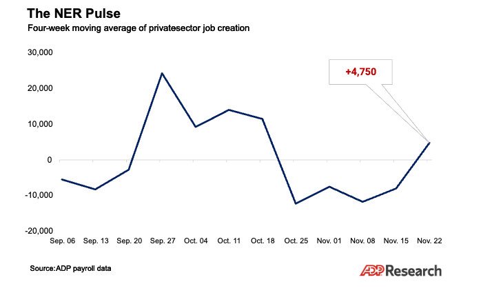 🤔 Job growth may be improving. According to payroll processor ADP, private U.S. employers added an average 4,750 jobs per week in the four weeks ending Nov. 22.