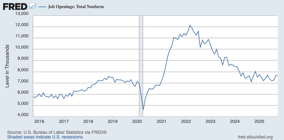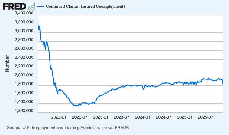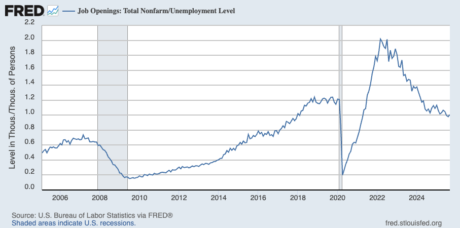 We don’t have October unemployment figures due to the government shutdown. But in September, there were 7.60 million unemployed people — meaning there were 1.0 job openings per unemployed person. This continues to be a sign of excess demand for labor. However, this metric has returned to prepandemic levels.