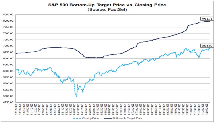 So far, we’ve been discussing strategists’ (top-down) forecasts. It so happens that the industry analysts (bottom-up) have price targets that are not far from the median strategist’s target.