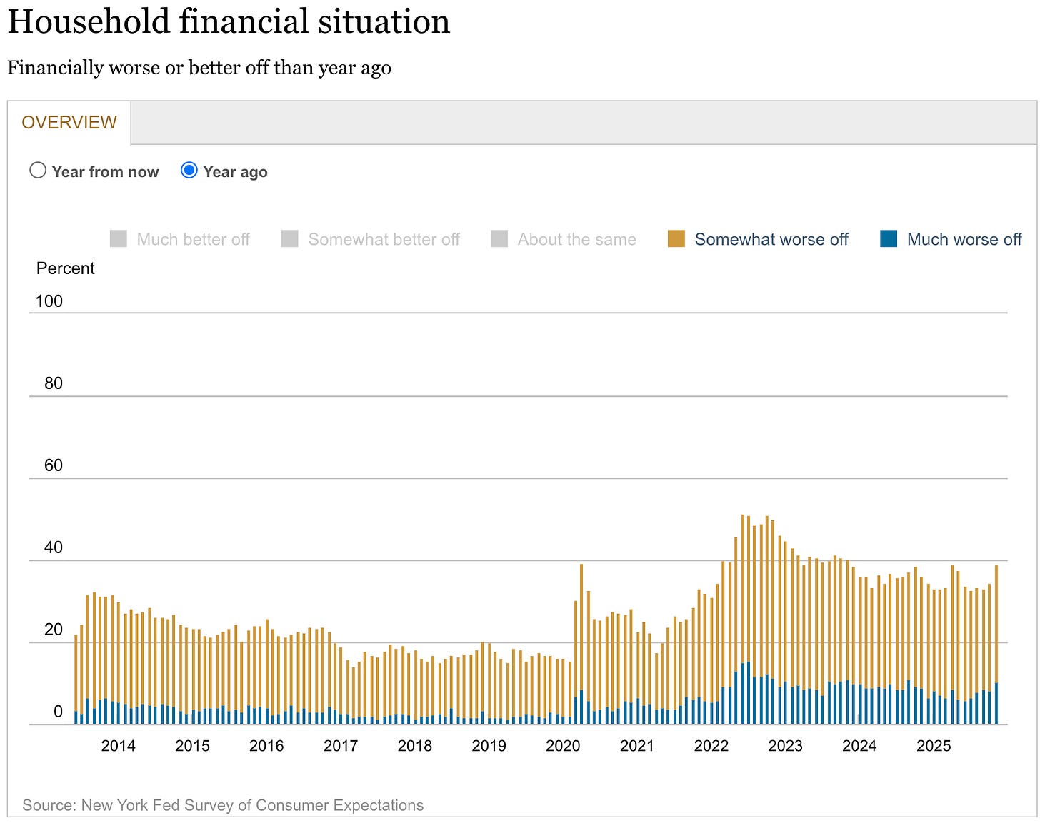👎 Consumers expect their financial situations to get worse. From the New York Fed’s November Survey of Consumer Expectations: “Perceptions about households’ current financial situations compared to a year ago deteriorated notably, with a larger share of respondents reporting that their households were worse off compared to a year ago, and a smaller share reporting they were better off.”