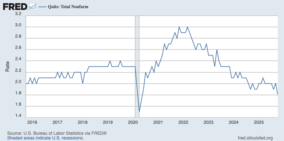 🤔 People are quitting less. In October, 2.94 million workers quit their jobs. This represents 1.8% of the workforce. The rate continues to trend below prepandemic levels.
