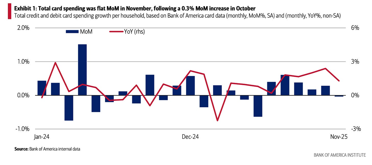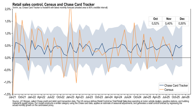 💳 Card spending data is holding up. From JPMorgan: “As of 05 Dec 2025, our Chase Consumer Card spending data (unadjusted) was 0.3% below the same day last year. Based on the Chase Consumer Card data through 05 Dec 2025, our estimate of the US Census October control measure of retail sales m/m is 0.52%.“