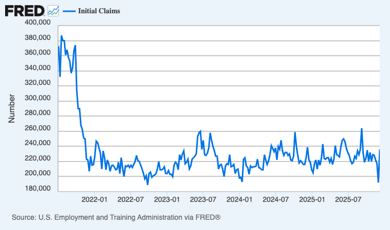 💼 New unemployment insurance claims rise, but total ongoing claims decline. Initial claims for unemployment benefits rose to 236,000 during the week ending Dec. 6, up from 192,000 the week prior. This metric remains at levels historically associated with economic growth.