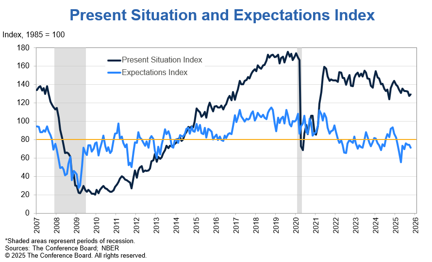 👎 Consumer confidence ticks lower. The Conference Board’s Consumer Confidence Index ticked 1 point lower in October. From the firm’s Stephanie Guichard: “The Present Situation Index regained some strength after September’s drop. Consumers’ view of current business conditions inched upward, while their appraisal of current job availability improved for the first time since December 2024. On the other hand, all three components of the Expectations Index weakened somewhat. Consumers were a bit more pessimistic about future job availability and future business conditions while optimism about future income retreated slightly.”