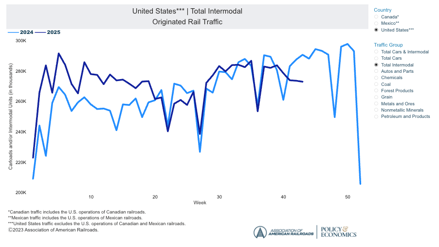 🚂 Freight rail traffic is down. Here’s Renaissance Macro’s Neil Dutta on AAR data: “Intermodal railcar loadings have declined against last year. For the week ending October 25, intermodal railcar loadings have declined 5.4 percent against the same week a year ago. Typically, we see intermodal carloads rising heading into this time of year. Perhaps inventories are not rising all that much heading into the holiday shopping season?“