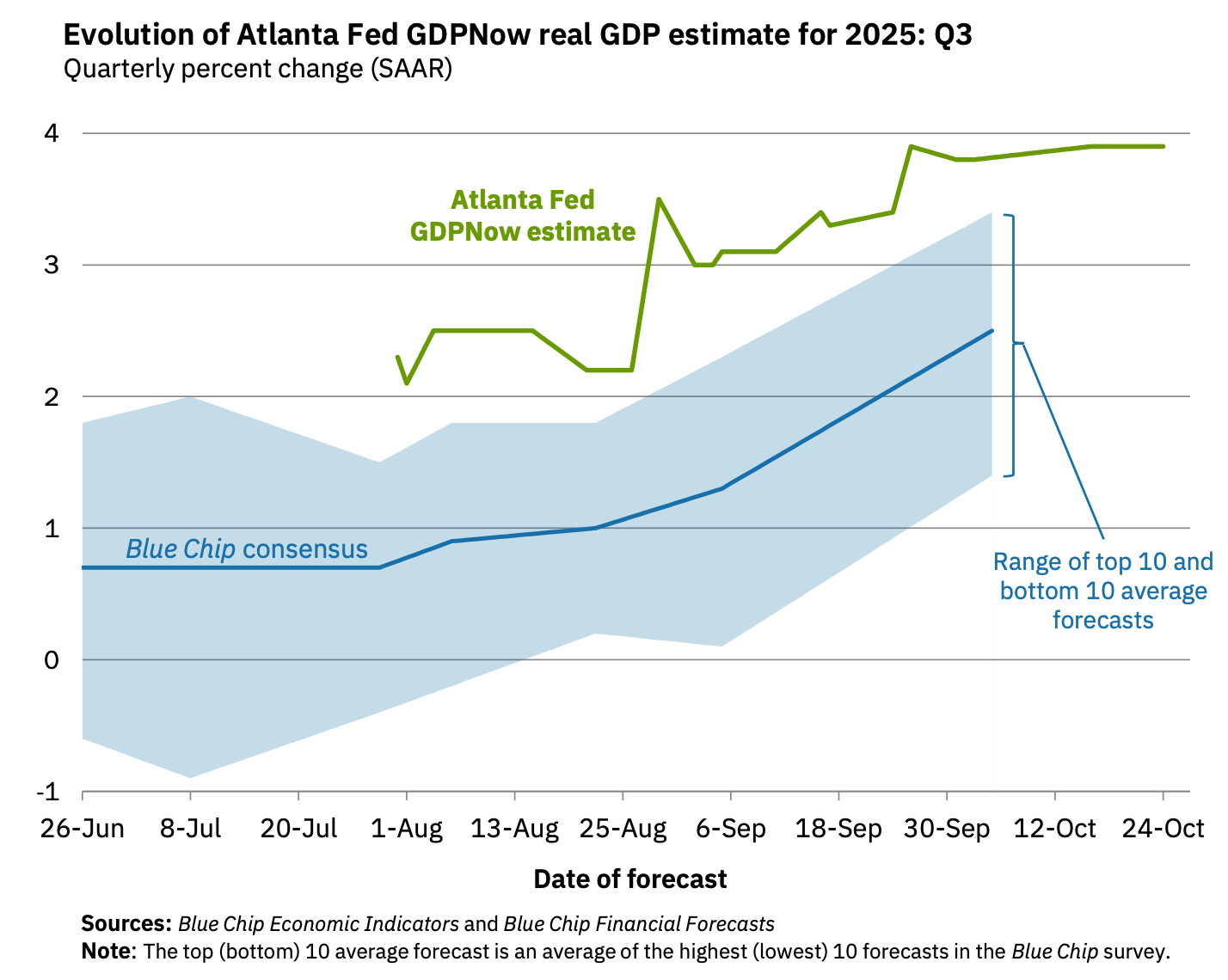 📈 Near-term GDP growth estimates are tracking positively. The Atlanta Fed’s GDPNow model sees real GDP growth rising at a 3.9% rate in Q3.