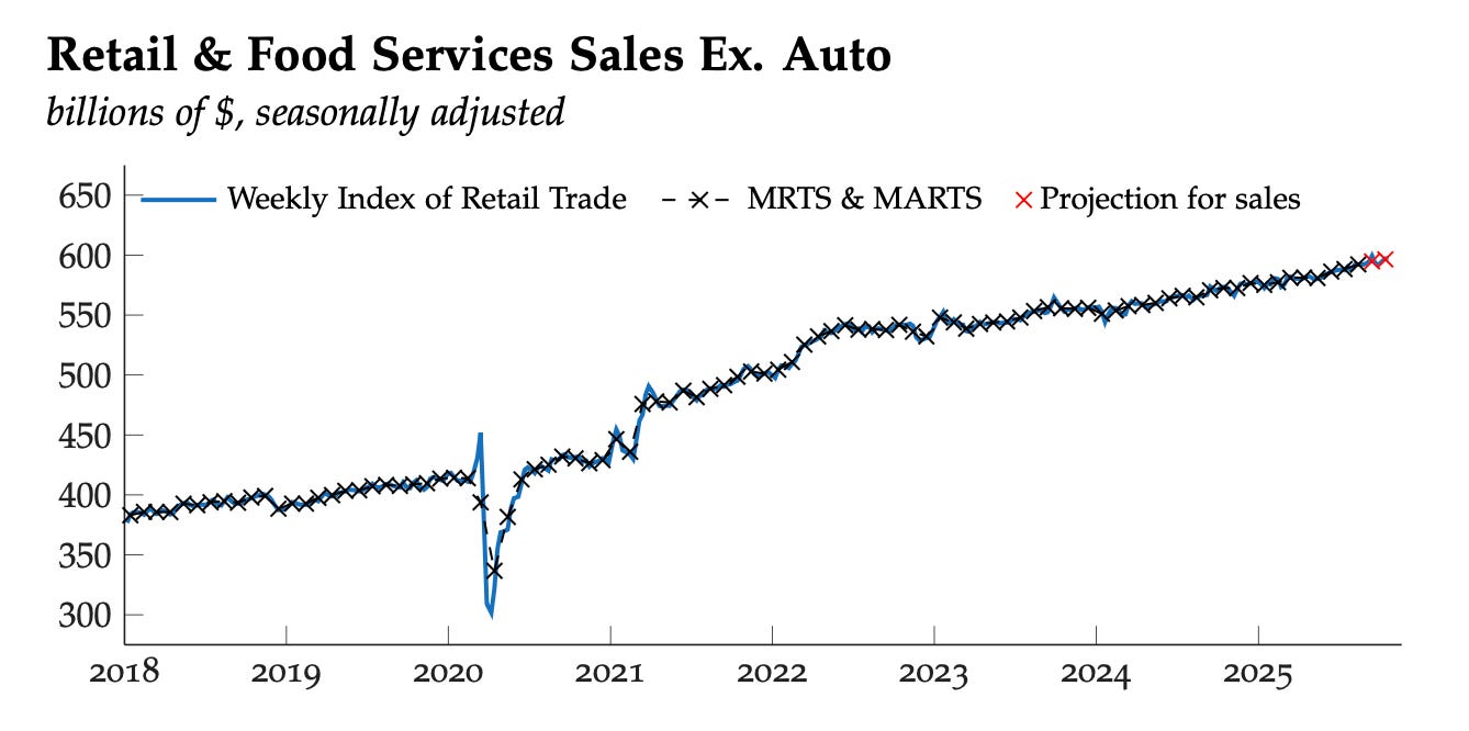 💳 Card spending data is holding up. From JPMorgan: “As of 24 Oct 2025, our Chase Consumer Card spending data (unadjusted) was 1.8% above the same day last year. Based on the Chase Consumer Card data through 24 Oct 2025, our estimate of the US Census September control measure of retail sales m/m is 0.07%.”