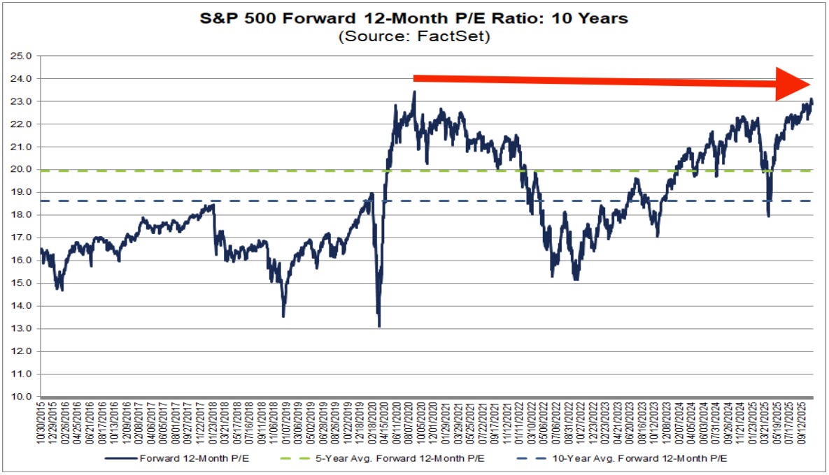 According to FactSet, the forward price-earnings (P/E) multiple for the S&P 500 is 22.9x, which is significantly above its 10-year average of 18.6x.