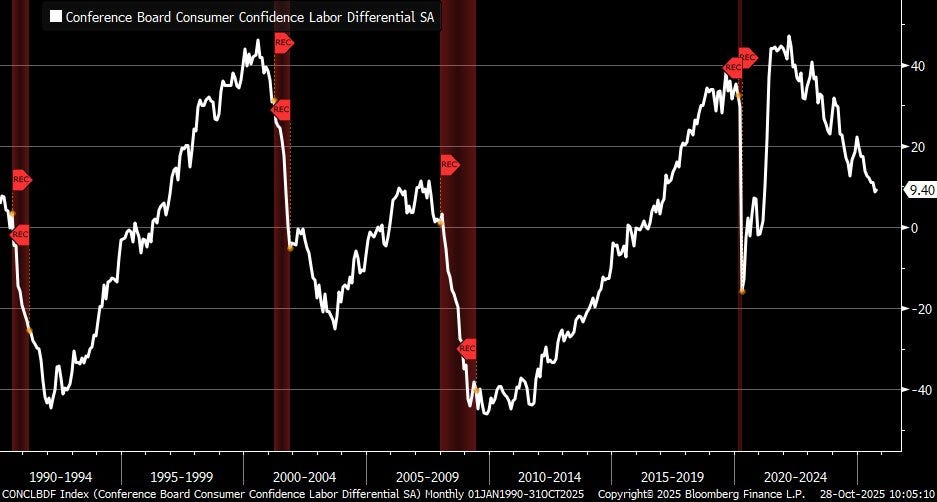 From Schwab’s Kevin Gordon: “Some minor relief for the Conference Board’s labor differential in October ... downtrend still unmistakable, though.“