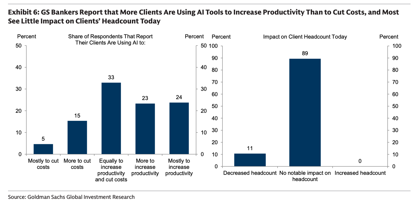 🤖 Companies are using AI for productivity. From Goldman Sachs’ survey of its investment bankers: “AI has so far been more used to increase productivity and revenue (47%) than to cut costs (20%). Furthermore, our survey suggests that only 11% of US companies are actively reducing headcount due to AI.”