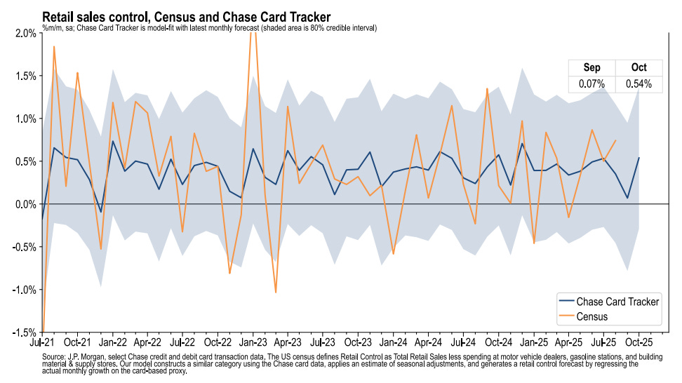 💳 Card spending data is holding up. From JPMorgan: “As of 24 Oct 2025, our Chase Consumer Card spending data (unadjusted) was 1.8% above the same day last year. Based on the Chase Consumer Card data through 24 Oct 2025, our estimate of the US Census September control measure of retail sales m/m is 0.07%.”