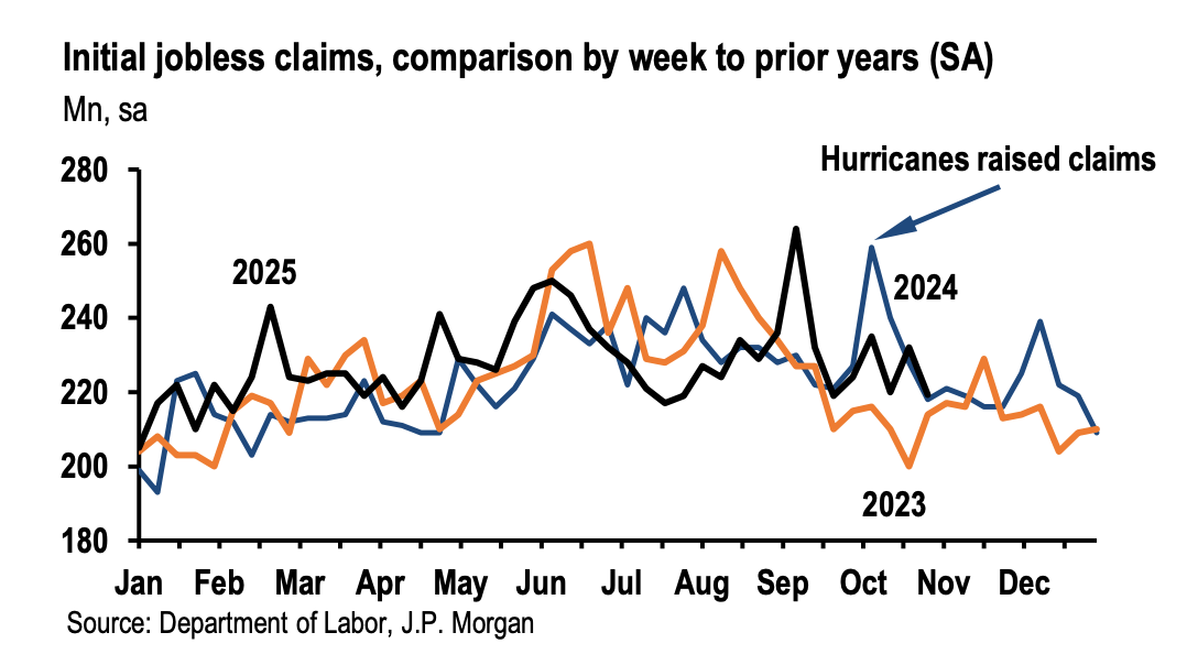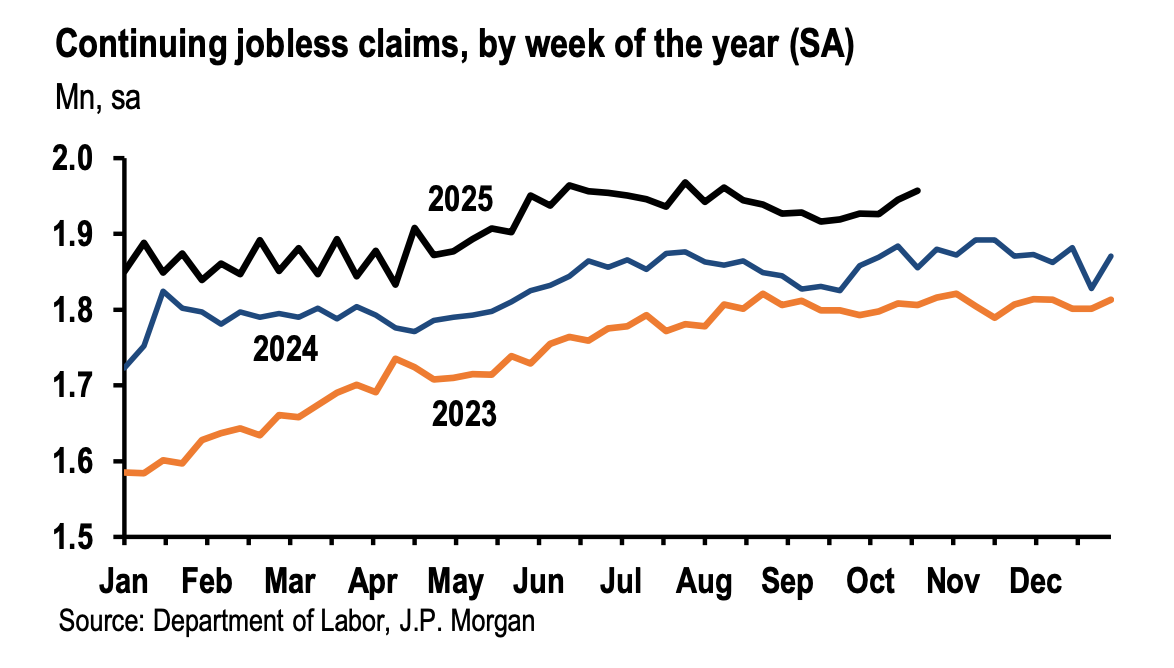 💼 Estimated new unemployment claims decline, total continuing claims rise. While the Department of Labor is not publishing unemployment claims reports, economists are estimating national numbers using state-level reports. From JPMorgan: “For the week ending October 25, initial claims dropped back to 219k from 232k in the prior week. This number is based on aggregating the available state data, which excluded reported values for Arizona and Massachusetts — two states that have frequently failed to report figures on Thursdays since the federal government shutdown began — as well as the District of Columbia. We extrapolated the missing values based on how they changed during the same week one year earlier in the non-seasonally adjusted data, then applied the seasonal factors to the resulting NSA state aggregate. Last week’s increase appeared concerning against the historical seasonal pattern of declines around this time of year, but the latest figure is more aligned with these prior dynamics over the year.“