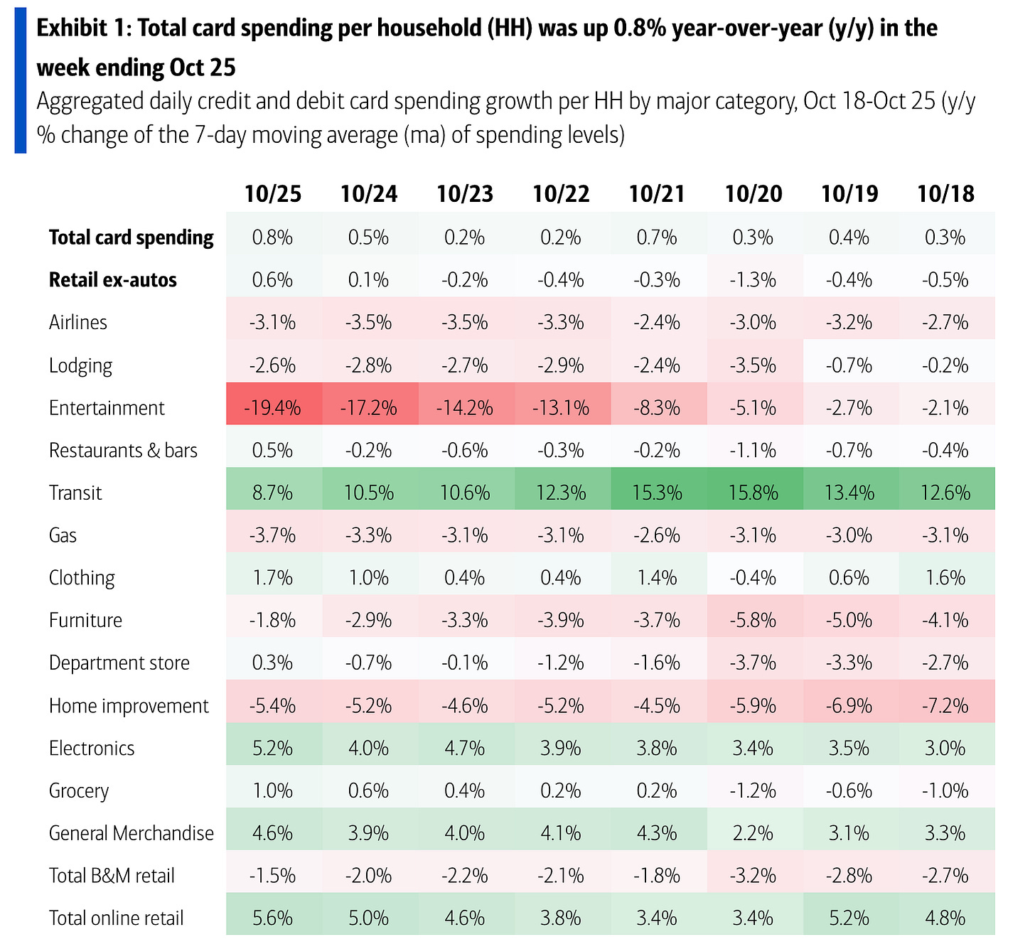 From BofA: “Total card spending per HH was up 0.8% y/y in the week ending Oct 25, according to BAC aggregated credit & debit card data. Y/y entertainment spending growth saw the biggest decline since last week. Department stores saw the biggest rise. Total card spending growth was up 0.4% y/y in week ending Oct 25 in DC MSA after a pull back last week.“