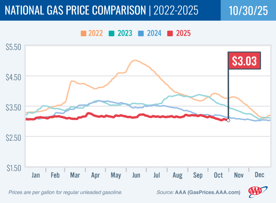 ⛽️ Gas prices tick lower. From AAA: “The national average for a gallon of regular was $3.15 one month ago and $3.07 a week ago. Today, the average is $3.03, once again creeping closer to the 3-dollar mark but not quite there yet. Gas prices have been cruising this month, as crude oil prices have remained relatively low due to higher supply and lower demand. Heading into November, drivers may see gas prices continue to fall and perhaps stay low over the busy Thanksgiving travel period.”
