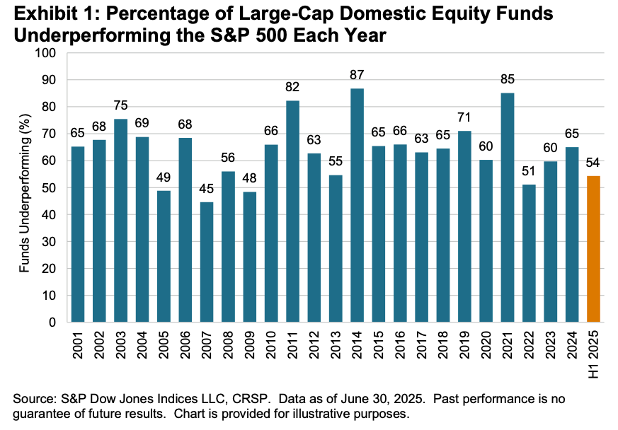 According to new data from S&P Dow Jones Indices (SPDJI), 54.3% of U.S. large-cap equity fund managers underperformed the S&P 500 in the first six months of 2025.