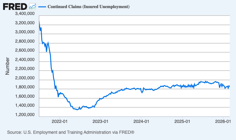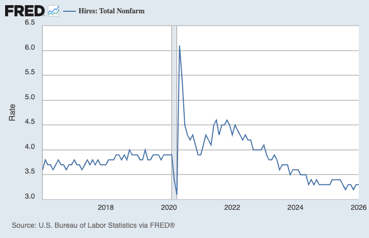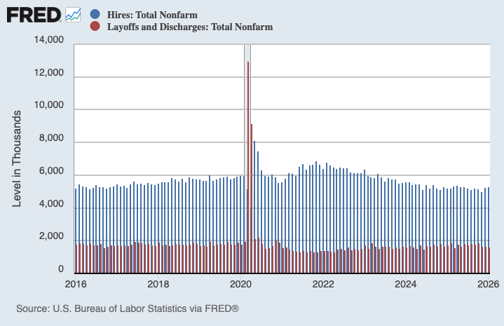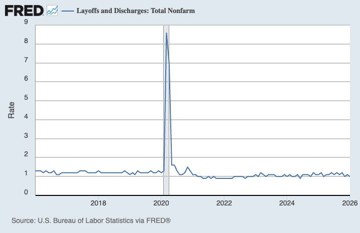 👍 Layoffs remain depressed, hiring remains firm. Employers laid off 1.63 million people in January. While challenging for the people affected, this figure represents just 1.0% of total employment. This metric remains slightly below prepandemic levels.