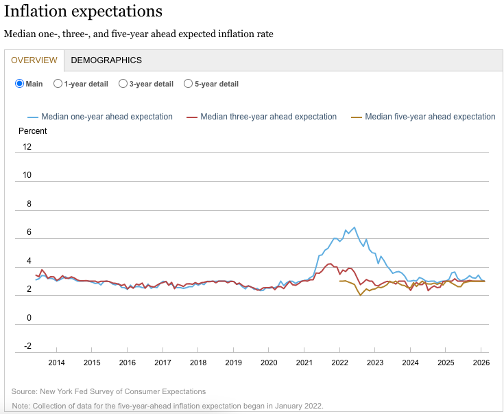 🎈 Inflation expectations were mostly unchanged. From the New York Fed’s February Survey of Consumer Expectations: “Median inflation expectations in February declined by 0.1 percentage point at the one-year-ahead horizon to 3.0% and remained steady at the three-year and five-year-ahead horizons at 3.0%.”
