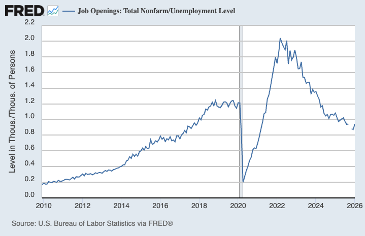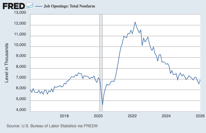 💼 Job openings tick up. According to the BLS’s Job Openings and Labor Turnover Survey, employers had 6.95 million job openings in January, up from 6.55 million in December. This metric is near its lowest point since December 2020.