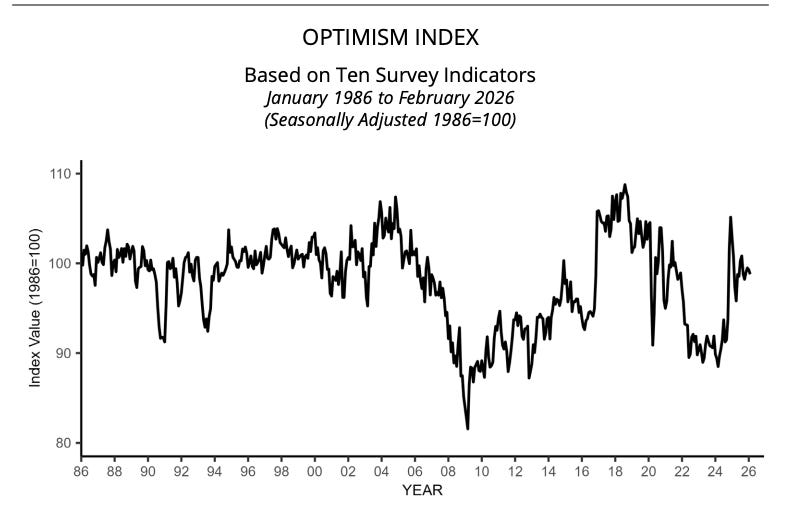 👎 Small business optimism ticks lower. The NFIB’s Small Business Optimism Index declined to 98.8 in February from 99.3 in January. From the NFIB: “Although optimism declined slightly, small businesses report feeling more certain in February as they look toward the coming months. High sales and increased profits made February a more positive month for many owners, but competition from large businesses is putting stress on Main Street firms as they navigate the current economic climate.”