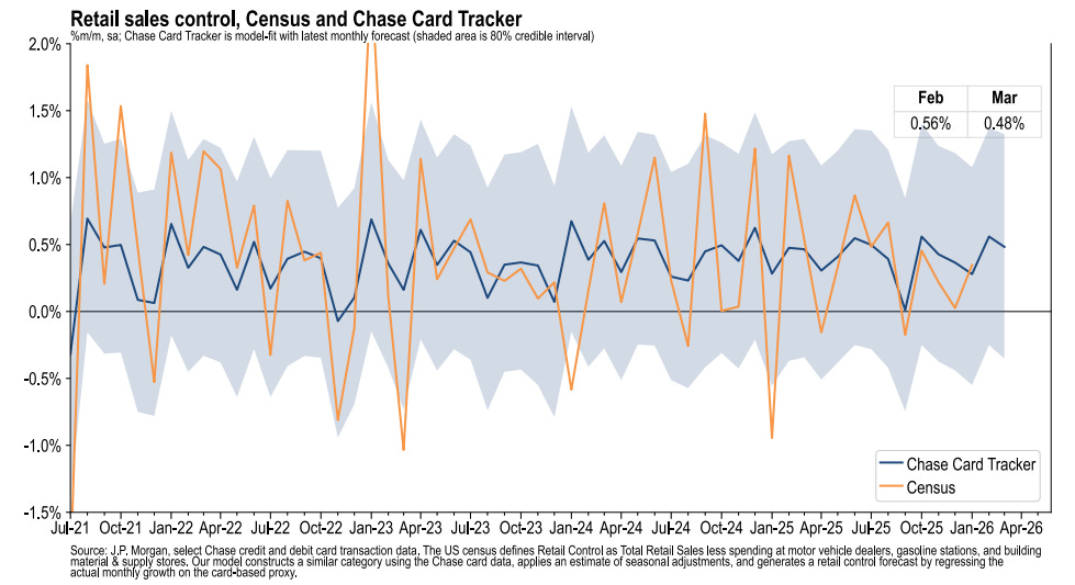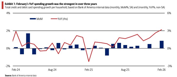 💳 Card spending data is holding up. From JPMorgan: “As of 06 Mar 2026, our Chase Consumer Card spending data (unadjusted) was 6.0% above the same day last year. Based on the Chase Consumer Card data through 06 Mar 2026, our estimate of the US Census February control measure of retail sales m/m is 0.56%.”