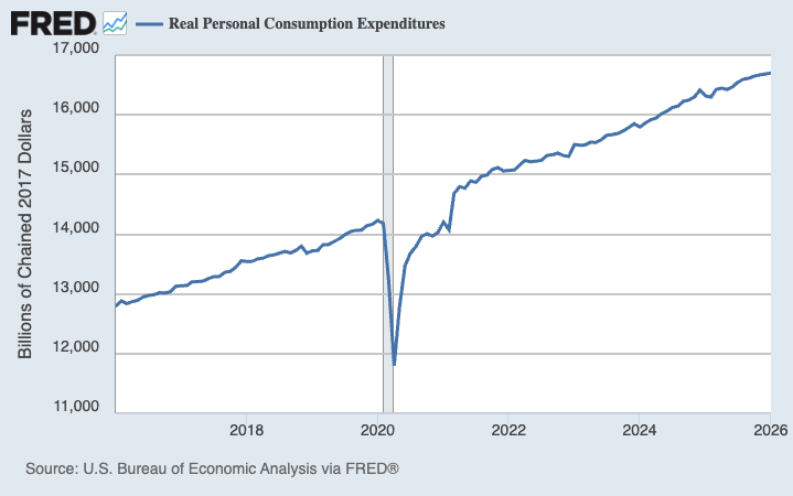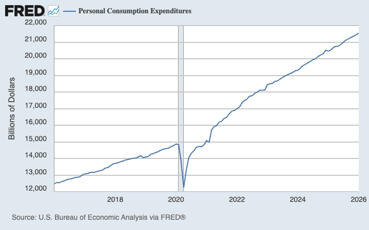 🛍️ Consumer spending ticks higher. According to BEA data, personal consumption expenditures increased 0.4% month-over-month in January to an annual rate of $21.54 trillion, an all-time high.