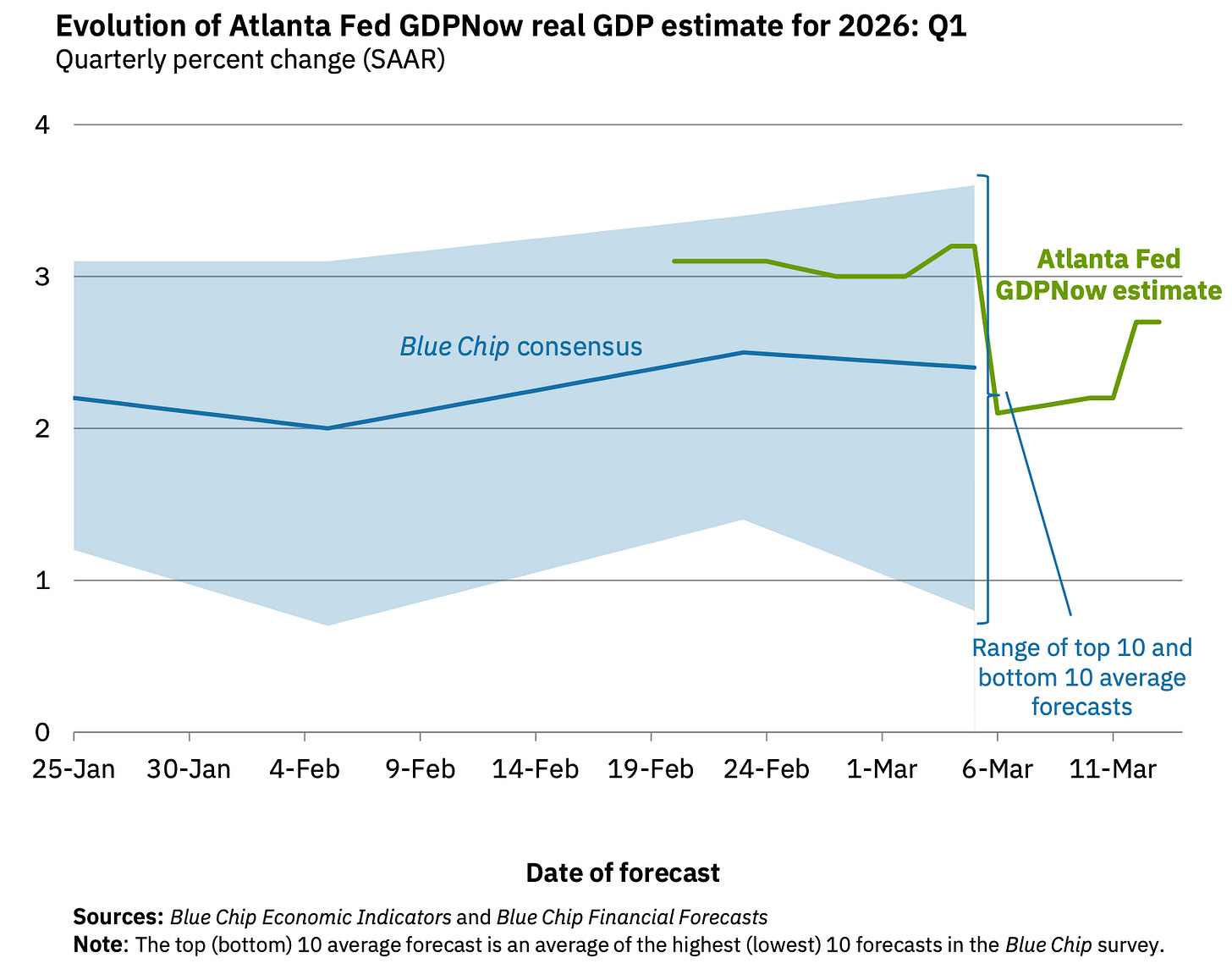 📈 Near-term GDP growth estimates are tracking positively. The Atlanta Fed’s GDPNow model sees real GDP growth rising at a 2.7% rate in Q1.