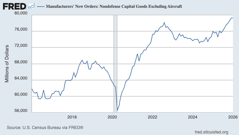 🏭 Business investment activity holds at record levels. Orders for nondefense capital goods excluding aircraft — a.k.a. core capex or business investment — declined marginally from its December peak to $79.27 billion in January.
