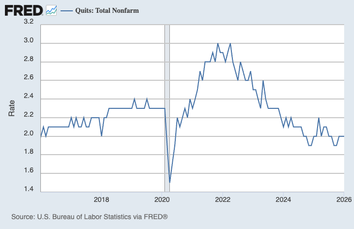🤔 People are quitting less. In January, 3.14 million workers quit their jobs. This represents 2.0% of the workforce. The rate continues to trend below prepandemic levels.