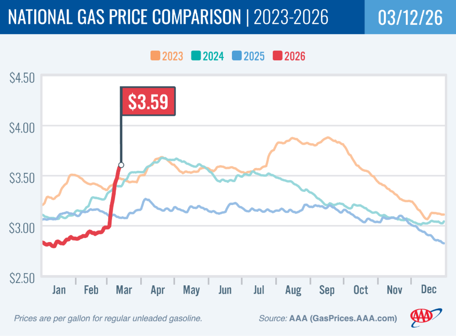 ⛽️ Gas prices jump. From AAA: “Spring Break season is here as the national average for a gallon of regular gasoline jumped nearly 35 cents since last week. Current prices are similar to the spring of 2024. Gasoline demand increases this time of year as the weather warms up and more drivers hit the road. Crude oil prices play a major role in what drivers pay at the pump, and prices have surpassed the $100/barrel mark multiple times in recent days. To help offset rising prices, the U.S. announced it will release 172 million barrels of oil from its strategic reserves over four months. The move is part of a broader effort by the International Energy Agency to release a total of 400 million barrels of oil, the largest emergency release in its history.”