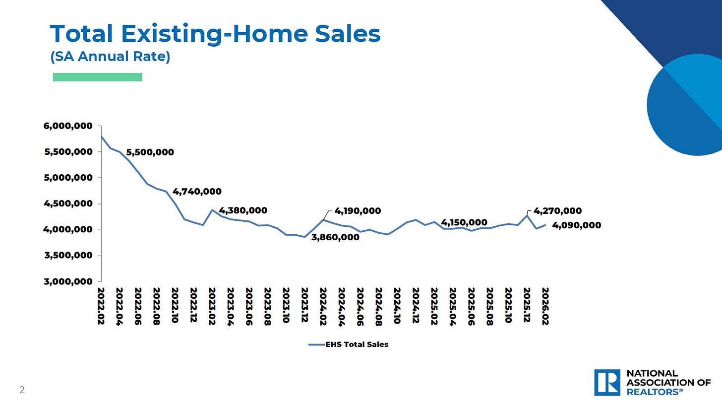 🏚 Home sales ticked higher. Sales of previously owned homes fell 1.7% in February to an annualized rate of 4.09 million units. From NAR chief economist Lawrence Yun: “Housing affordability is improving, and consumers are responding. Still, there is a long way to go to return to pre-pandemic levels of transaction activity. There are more than 6 million more jobs than in 2019, yet home sales per year are down by one million.”