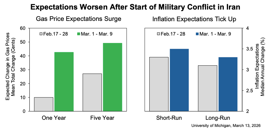 The Iran war and spike in gas prices are already weighing on sentiment. From the University of Michigan’s March Surveys of Consumers: “Consumer sentiment dipped about 2%, reaching its lowest reading of the year. Interviews completed prior to the military action in Iran showed an improvement in sentiment from last month, but lower readings seen during the nine days thereafter completely erased those initial gains. Gasoline prices have exerted the most immediate impact felt by consumers, though the magnitude of pass-through to other prices remains highly uncertain. A broad swath of consumers across incomes, age, and political affiliation all reported declines in expectations for their personal finances, down 7.5% nationally.“