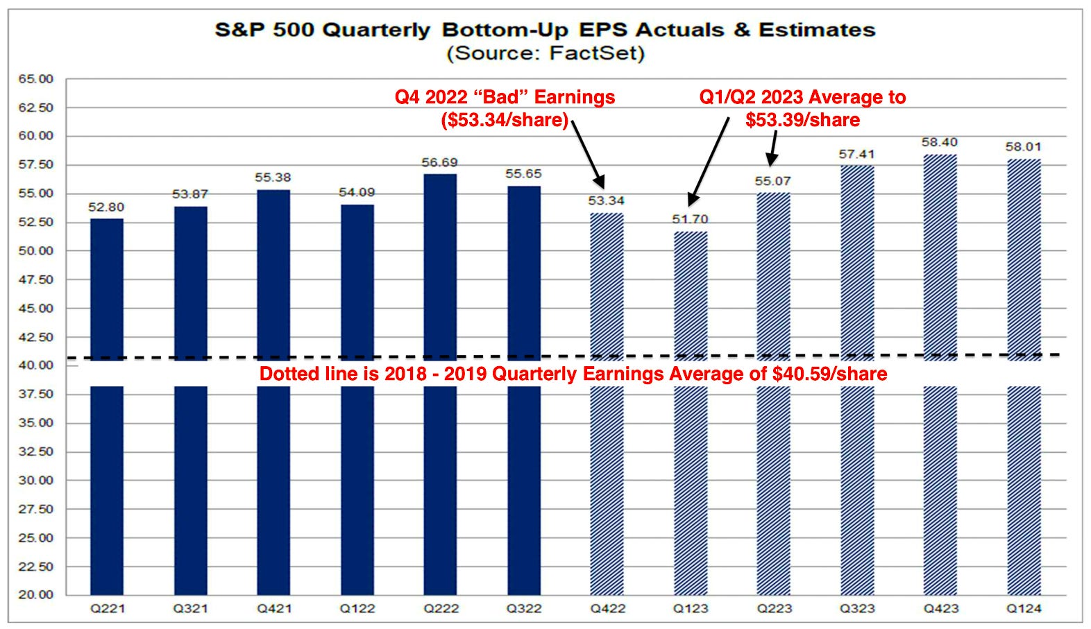 Colas shared this annotated chart of the S&P 500βs quarterly earnings per share (EPS) β actual EPS from the recent past and expected EPS for the near future.