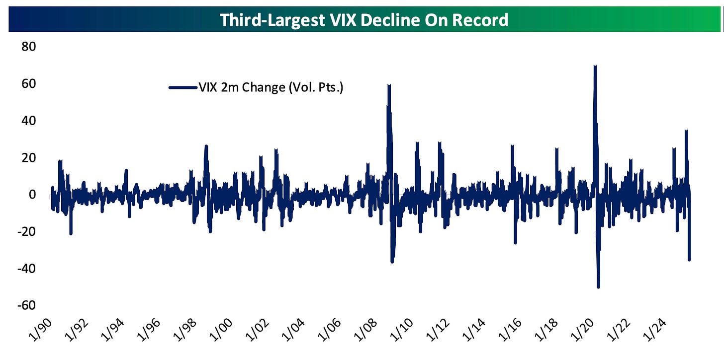 β[T]he 35 point drop in the VIX over [the two months since April 2] is the third-largest in the history of the index back to 1990, only overshadowed by the two months ended December 26, 2008, and May 14, 2020,β Bespoke Investment Group analysts observed on Monday.